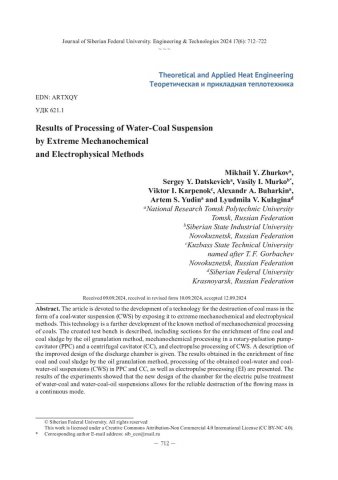Библиографическое описание: Результаты обработки водоугольной суспензии экстремальными механохимическим и электрофизическим методами / М. Ю. Журков, С. Ю. Дацкевич, В. И. Мурко [и др.]. - Текст : непосредственный // Журнал Сибирского федерального университета. Техника и технологии. - 2024. - Т. 17, № 6. - С. 712-722. - Библиогр. в конце ст. - ISSN 1999-494X.