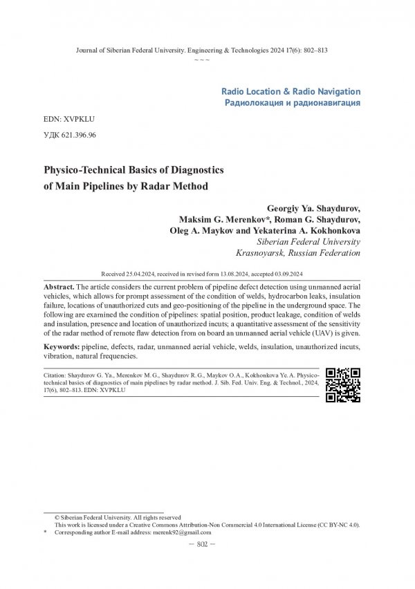 Библиографическое описание: Физико-технические основы диагностики магистральных трубопроводов методом радиолокации / Г. Я. Шайдуров, М. Г. Меренков, Р. Г. Шайдуров [и др.]. - Текст : непосредственный // Журнал Сибирского федерального университета. Техника и технологии. - 2024. - Т. 17, № 6. - С. 802-813. - Библиогр. в конце ст. - ISSN 1999-494X.