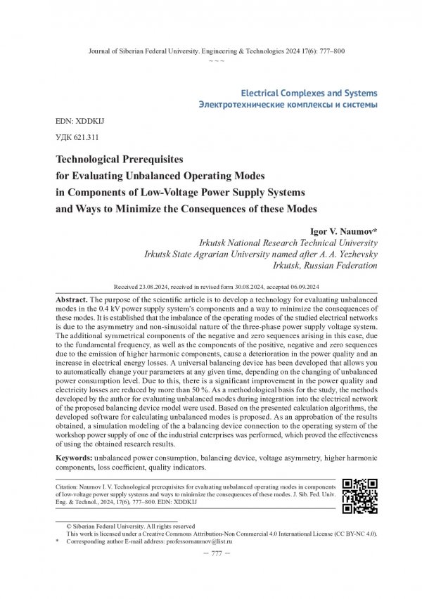 Аннотация: Целью научной статьи является разработка технологии оценки несбалансированных режимов в компонентах систем электроснабжения напряжением 0,4 кВ и способа минимизаций последствий этих режимов. Установлено, что несбалансированность режимов работы исследуемых электрических сетей обусловлена несимметрией и несинусоидальностью трёхфазной системы напряжения электропитания. Возникающие при этом дополнительные симметричные составляющие обратной и нулевой последовательности, обусловленные основной частотой, а также составляющие прямой, обратной и нулевой последовательностей, обусловленных эмиссией высших гармонических составляющих, вызывают ухудшение качества электрической энергии и возрастание потерь электрической энергии. Разработано универсальное балансирующее устройство, позволяющее в автоматическом режиме в каждый момент времени изменять свои параметры, в зависимости от изменяющегося уровня несбалансированного электропотребления. За счет этого происходит значительное улучшение показателей качества электрической энергии и более чем на 50 % снижаются потери электроэнергии. В качестве методологической базы исследования использовались разработанные автором методы оценки несбалансированных режимов при интеграции в электрическую сеть предлагаемой модели балансирующего устройства. На основе представленных алгоритмов расчета предложено разработанное программное обеспечение расчетов несбалансированных режимов. В качестве апробации полученных результатов произведено имитационное моделирование подключения балансирующего устройства в действующую систему цехового электроснабжения одного из промышленных предприятий, которое доказало эффективность использования полученных результатов исследования.