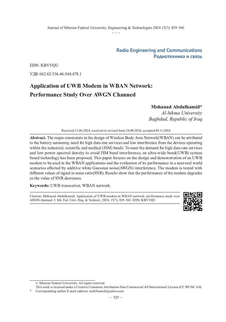 Библиографическое описание: Mohanad Abdulhamid. Application of UWB Modem in WBAN Network: Performance Study Over AWGN Channed = Применение UWB-модема в сети WBAN: исследование производительности по каналу AWGN / Mohanad Abdulhamid. - Текст : непосредственный // Журнал Сибирского федерального университета. Техника и технологии. - 2024. - Т. 17, № 7. - С. 929-941. - Библиогр. в конце ст. - ISSN 1999-494X.
