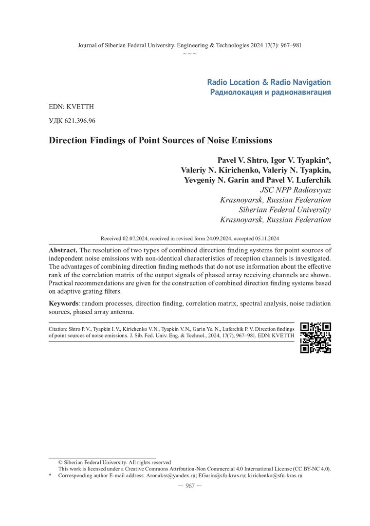 Библиографическое описание: Пеленгации точечных источников шумовых излучений / П. В. Штро, И. В. Тяпкин, В. Н. Кириченко [и др.]. - Текст : непосредственный // Журнал Сибирского федерального университета. Техника и технологии. - 2024. - Т. 17, № 7. - С. 967-981. - Библиогр. в конце ст. - ISSN 1999-494X.
