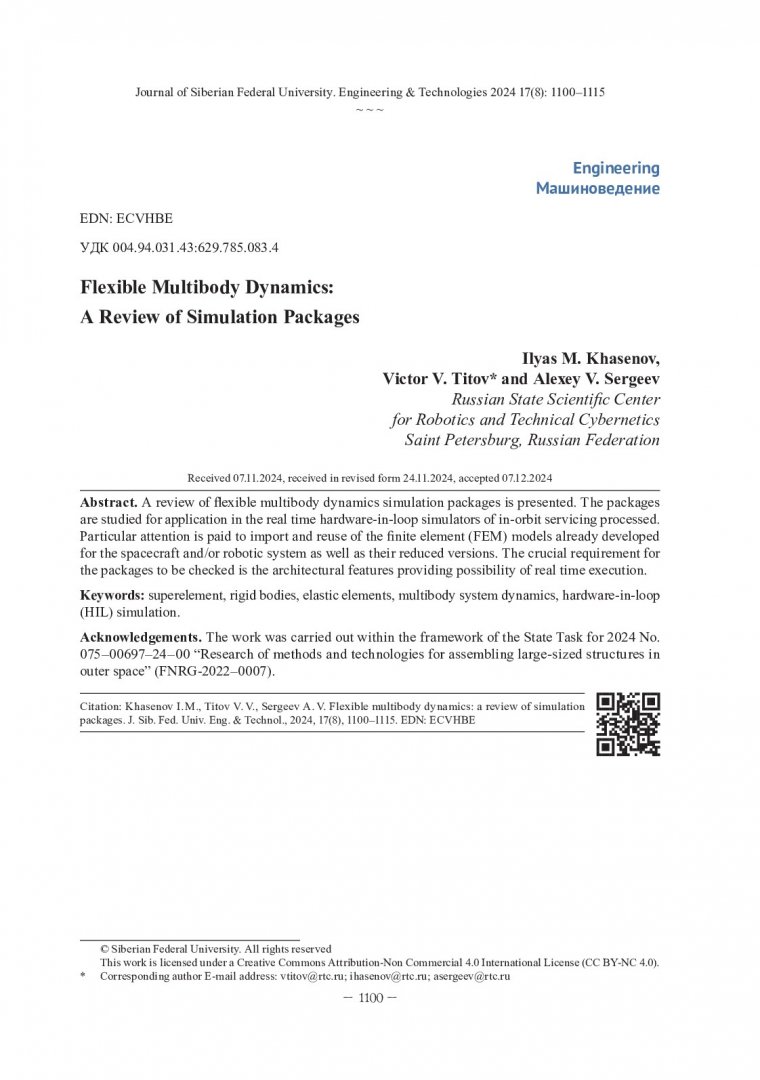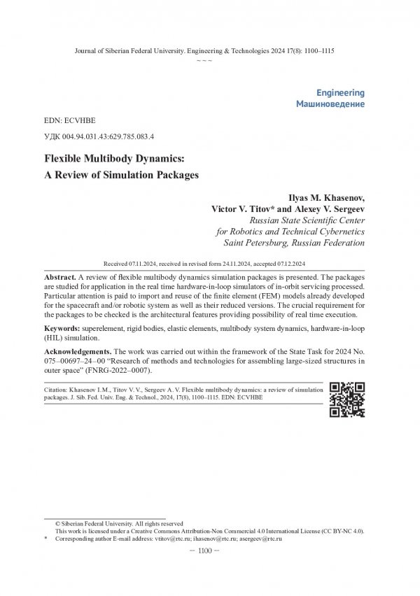 Библиографическое описание: Хасенов, И. М. Моделирование динамики систем твёрдых и упругих тел: обзор пакетов моделирования / И. М. Хасенов, В. В. Титов, А. В. Сергеев. - Текст : непосредственный // Журнал Сибирского федерального университета. Техника и технологии. - 2024. - Т. 17, № 8. - С. 1100-1115. - Библиогр.: с. 1114-1115. - ISSN 1999-494X.