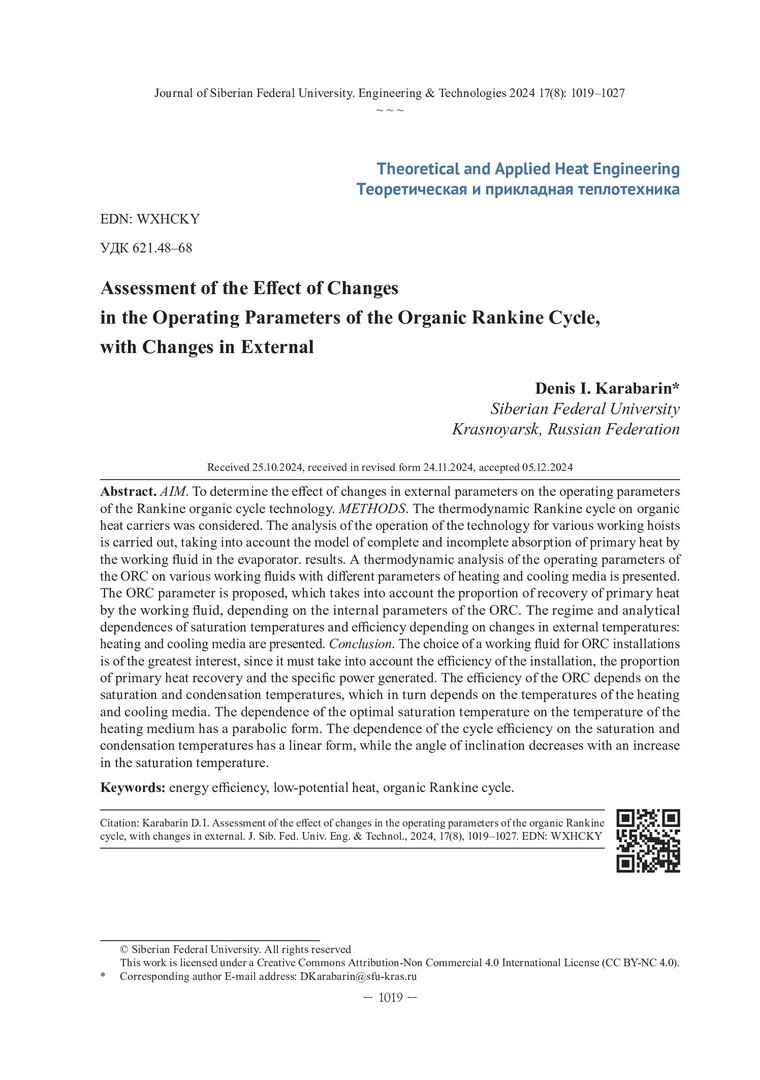 Библиографическое описание: Карабарин, Д. И. Оценка влияния изменения режимных параметров органического цикла Ренкина при изменении внешних / Д. И. Карабарин. - Текст : непосредственный // Журнал Сибирского федерального университета. Техника и технологии. - 2024. - Т. 17, № 8. - С. 1019-1027. - Библиогр.: с. 1026-1027. - ISSN 1999-494X.