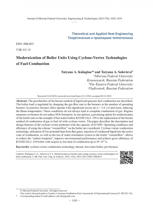 Библиографическое описание: Кулагина, Т. А. Модернизация котельных агрегатов с использованием циклонно-вихревых технологий сжигания топлива / Т. А. Кулагина, Т. А. Соловьева. - Текст : непосредственный // Журнал Сибирского федерального университета. Техника и технологии. - 2024. - Т. 17, № 8. - С. 1028-1034. - Библиогр.: с. 1033-1034. - ISSN 1999-494X.