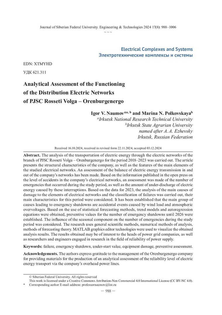 Библиографическое описание: Наумов, И. В. Аналитическая оценка функционирования распределительных электрических сетей ПАО "Россети Волга" – "Оренбургэнерго" / И. В. Наумов, Полковская. - Текст : непосредственный // Журнал Сибирского федерального университета. Техника и технологии. - 2024. - Т. 17, № 8. - С. 988-1006. - Библиогр.: с. 1002-1006. - ISSN 1999-494X.