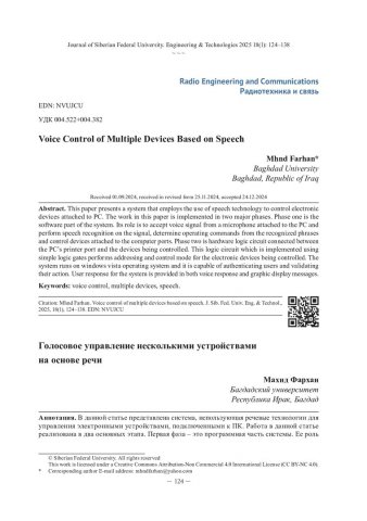 Библиографическое описание: Mhnd Farhan. Voice Control of Multiple Devices Based on Speech = Голосовое управление несколькими устройствами на основе речи / Mhnd Farhan. - Текст : непосредственный // Журнал Сибирского федерального университета. Техника и технологии. - 2025. - Т. 18, № 1. - С. 124-138. - ISSN 1999-494X.