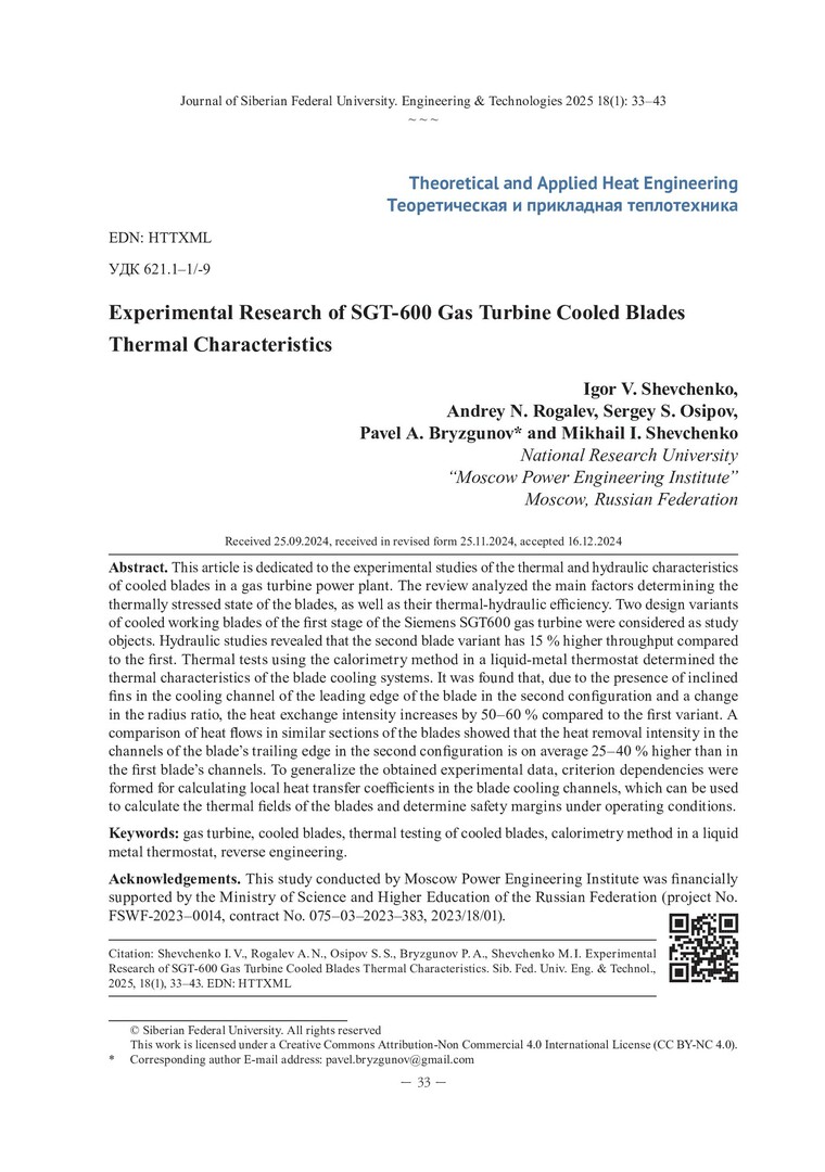 Библиографическое описание: Экспериментальное исследование тепловых характеристик охлаждаемых рабочих лопаток газовой турбины SGT‑600 / И. В. Шевченко, А. Н. Рогалев, С. К. Осипов [и др.]. - Текст : непосредственный // Журнал Сибирского федерального университета. Техника и технологии. - 2025. - Т. 18, № 1. - С. 33-43. - Библиогр.: с. 42-43. - ISSN 1999-494X.