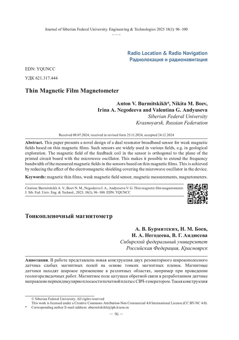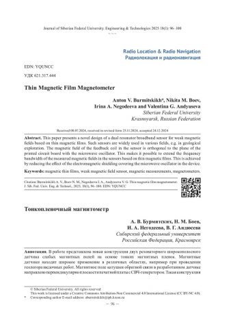 Библиографическое описание: Thin Magnetic Film Magnetometer = Тонкопленочный магнитометр / A. V. Burmitskikh, N. M. Boev, I. A. Negodeeva, V. G. Andyuseva. - Текст : непосредственный // Журнал Сибирского федерального университета. Техника и технологии. - 2025. - Т. 18, № 1. - С. 96-100. - ISSN 1999-494X.