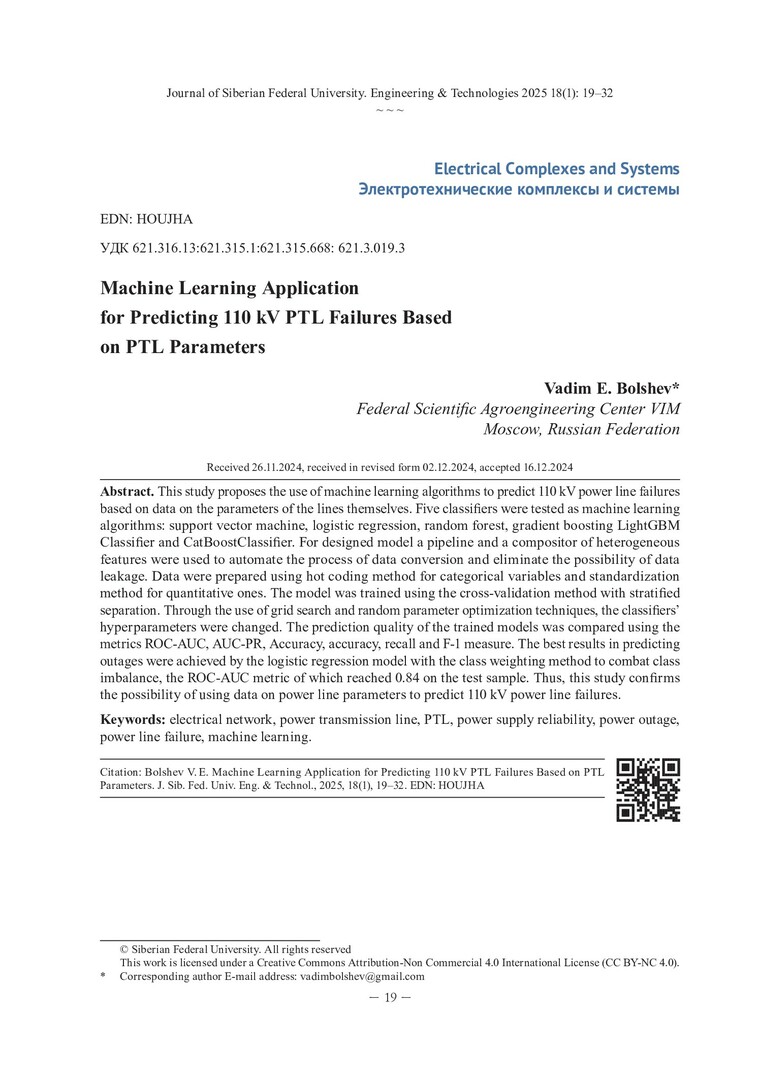 Библиографическое описание: Большев, В. Е. Использование машинного обучения для прогнозирования отключений электроэнергии на ЛЭП 110 кВ на основе параметров самих ЛЭП / В. Е. Большев. - Текст : непосредственный // Журнал Сибирского федерального университета. Техника и технологии. - 2025. - Т. 18, № 1. - С. 19-32. - Библиогр.: с. 30-32. - ISSN 1999-494X.