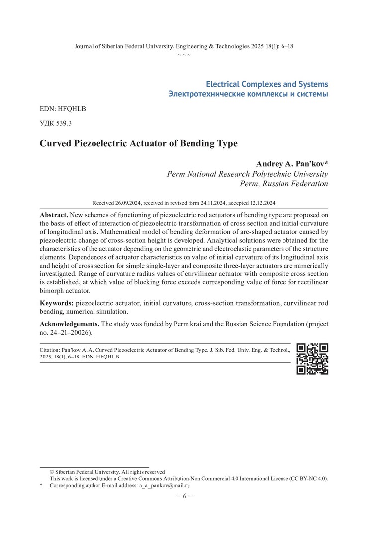 Библиографическое описание: Паньков, А. А. Криволинейный пьезоэлектрический актюатор изгибного типа = Curved Piezoelectric Actuator of Bending Type / А. А. Паньков. - Текст : непосредственный // Журнал Сибирского федерального университета. Техника и технологии. - 2025. - Т. 18, № 1. - С. 6-18. - ISSN 1999-494X.