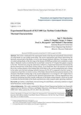 Библиографическое описание: Экспериментальное исследование тепловых характеристик охлаждаемых рабочих лопаток газовой турбины SGT‑600 = Experimental Research of SGT‑600 Gas Turbine Cooled Blades Thermal Characteristics / И. В. Шевченко, А. Н. Рогалев, С. К. Осипов [и др.]. - Текст : непосредственный // Журнал Сибирского федерального университета. Техника и технологии. - 2025. - Т. 18, № 1. - С. 33-43. - ISSN 1999-494X.