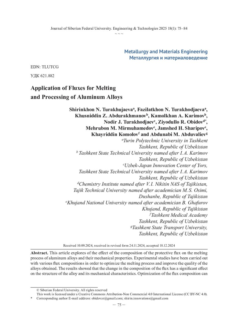 Библиографическое описание: Application of Fluxes for Melting and Processing of Aluminum Alloys = Применение флюсов для плавки и обработки алюминиевых сплавов / S. N. Turakhujaeva, F. N. Turakhodjaeva, K. Z. Abdurakhmanov [et al.]. - Текст : непосредственный // Журнал Сибирского федерального университета. Техника и технологии. - 2025. - Т. 18, № 1. - С. 75-84. - Библиогр.: с. 82-84. - ISSN 1999-494X.