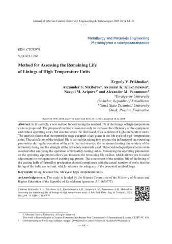 Библиографическое описание: Методика оценки остаточного ресурса футеровок высокотемпературных агрегатов = Мethod for Assessing the Remaining Life of Linings of High Temperature Units / Е. В. Приходько, А. С. Никифоров, А. К. Кинжибекова [и др.]. - Текст : непосредственный // Журнал Сибирского федерального университета. Техника и технологии. - 2025. - Т. 18, № 1. - С. 64-74. - ISSN 1999-494X.