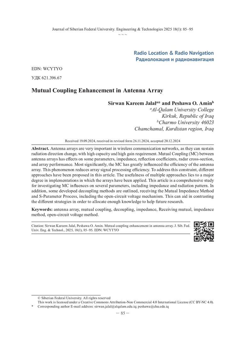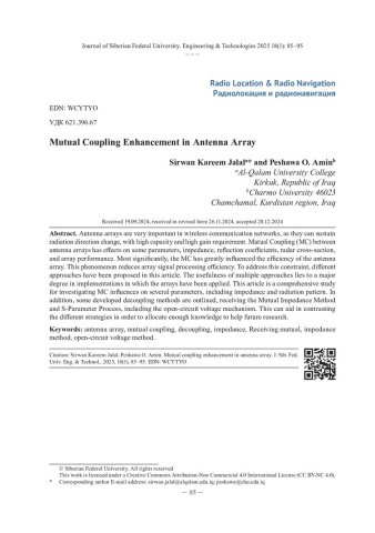 Библиографическое описание: Sirwan Kareem Jalal. Mutual Coupling Enhancement in Antenna Array = Усиление взаимной связи в массиве антенн / Sirwan Kareem Jalal, Peshawa O. Amin. - Текст : непосредственный // Журнал Сибирского федерального университета. Техника и технологии. - 2025. - Т. 18, № 1. - С. 85-95. - ISSN 1999-494X.
