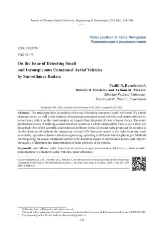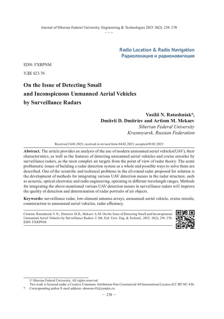 Библиографическое описание: Ратушняк, В. Н. К вопросу об обнаружении малоразмерных и малозаметных беспилотных летательных аппаратов обзорными радиолокационными станциями / В. Н. Ратушняк, Д. Д. Дмитриев, А. М. Мекаев. - Текст : непосредственный // Журнал Сибирского федерального университета. Техника и технологии. - 2025. - Т. 18, № 2. - С. 258-270. - Библиогр.: с. 269-270. - ISSN 1999-494X.