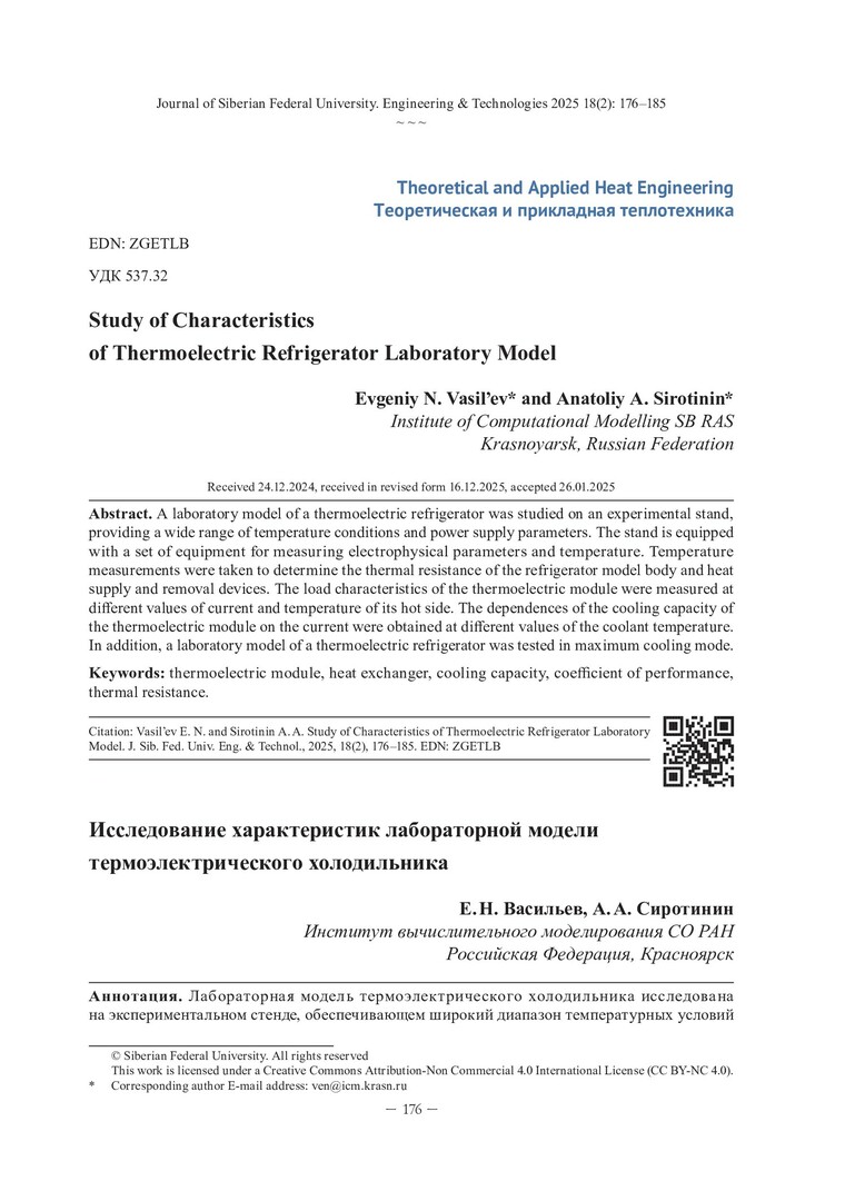 Библиографическое описание: Васильев, Е. Н. Исследование характеристик лабораторной модели термоэлектрического холодильника / Е. Н. Васильев, А. А. Сиротинин. - Текст : непосредственный // Журнал Сибирского федерального университета. Техника и технологии. - 2025. - Т. 18, № 2. - С. 176-185. - Библиогр.: с. 184-185. - ISSN 1999-494X.