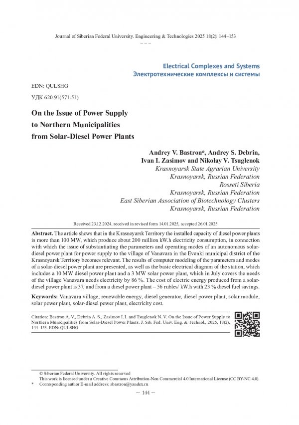 Библиографическое описание: К вопросу об электроснабжении северных муниципальных образований от солнечно-дизельных электростанций / А. В. Бастрон, А. С. Дебрин, И. И. Засимов, Н. В. Цугленок. - Текст : непосредственный // Журнал Сибирского федерального университета. Техника и технологии. - 2025. - Т. 18, № 2. - С. 144-153. - Библиогр.: с. 152-153. - ISSN 1999-494X.