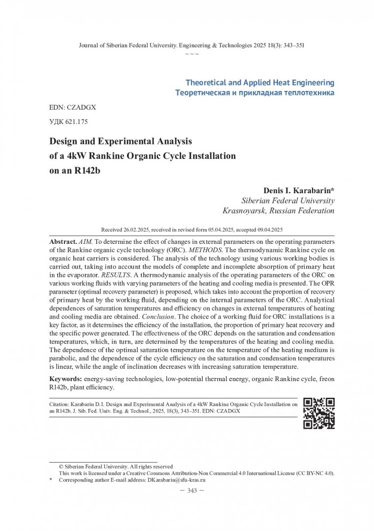Библиографическое описание: Карабарин, Д. И. Проектирование и экспериментальный анализ установки органического цикла Ренкина на 4кВт на рабочем теле R142b / Д. И. Карабарин. - Текст : непосредственный // Журнал Сибирского федерального университета. Техника и технологии. - 2025. - Т. 18, № 3. - С. 343-351. - Библиогр.: с. 351. - ISSN 1999-494X.