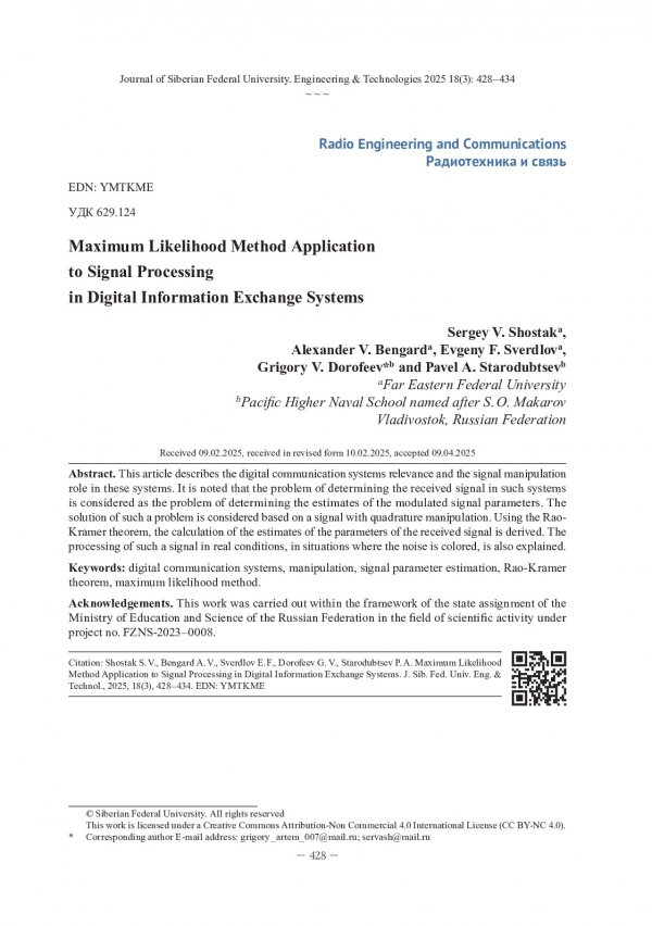 Библиографическое описание:Применение метода максимального правдоподобия для обработки сигналов в цифровых системах обмена информацией / С. В. Шостак, А. В. Бенгард, Е. А. Свердлов [и др.]. - Текст : непосредственный // Журнал Сибирского федерального университета. Техника и технологии. - 2025. - Т. 18, № 3. - С. 428-434. - Библиогр.: с. 434. - ISSN 1999-494X.