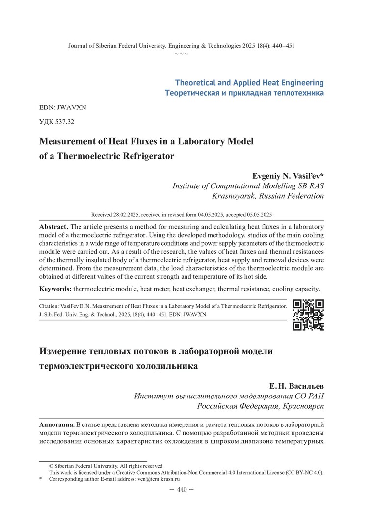 Библиографическое описание:Васильев, Е. Н. Измерение тепловых потоков в лабораторной модели термоэлектрического холодильника / Е. Н. Васильев. - Текст : непосредственный // Журнал Сибирского федерального университета. Техника и технологии. - 2025. - Т. 18, № 4. - С. 440-451. - Библиогр.: с. 450-451. - ISSN 1999-494X.