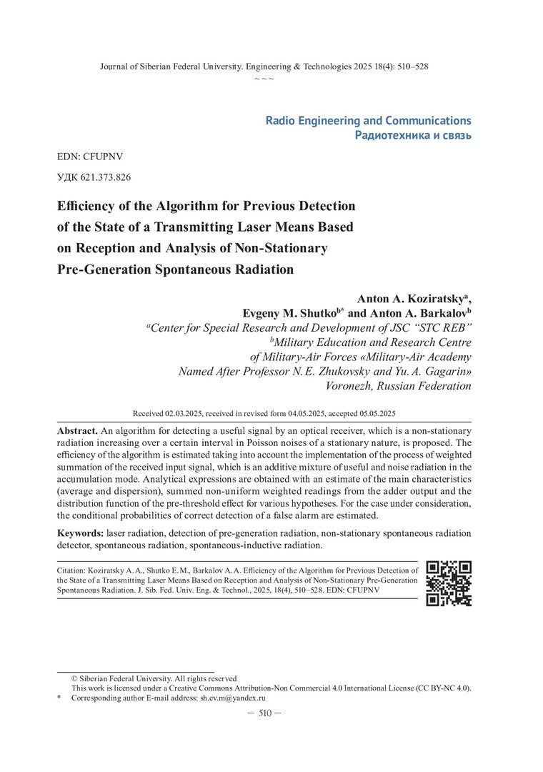 Библиографическое описание:Козирацкий, А. А. Эффективность алгоритма упреждающего обнаружения состояния передающего лазерного средства на основе приема и анализа нестационарного предгенерационного спонтанного излучения / А. А. Козирацкий, Е. М. Шутько, А. А. Баркалов. - Текст : непосредственный // Журнал Сибирского федерального университета. Техника и технологии. - 2025. - Т. 18, № 4. - С. 510-528. - Библиогр.: с. 525-528. - ISSN 1999-494X.