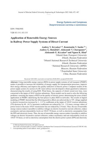 Библиографическое описание: Применение возобновляемых источников энергии в системах электроснабжения железных дорог постоянного тока / А. В. Крюков, К. В. Суслов, А. Г. Батухтин [и др.]. - Текст : непосредственный // Журнал Сибирского федерального университета. Техника и технологии. - 2025. - Т. 18, № 4. - С. 472-487. - Библиогр.: с. 485-487. - ISSN 1999-494X.
