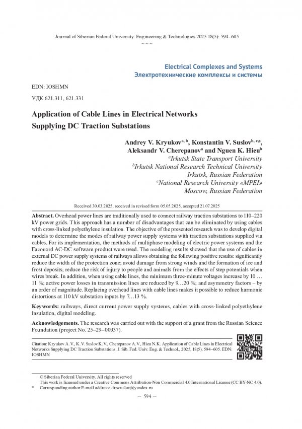 Библиографическое описание: Применение кабельных линий в электрических сетях, питающих тяговые подстанции постоянного тока / А. В. Крюков, К. В. Суслов, А. В. Черепанов, Нгуен Куок Хиеу. - Текст : непосредственный // Журнал Сибирского федерального университета. Техника и технологии. - 2025. - Т. 18, № 5. - С. 594-605. - Библиогр.: с. 604-605. - ISSN 1999-494X.
