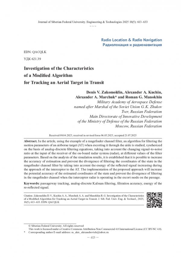 Библиографическое описание: Исследование характеристик модифицированного алгоритма сопровождения воздушной цели на проходе / Д. В. Закомолдин, А. А. Кучин, А. А. Марчук, Р. Г. Манохин. - Текст : непосредственный // Журнал Сибирского федерального университета. Техника и технологии. - 2025. - Т. 18, № 5. - С. 613-633. - Библиогр.: с. 632-633. - ISSN 1999-494X.