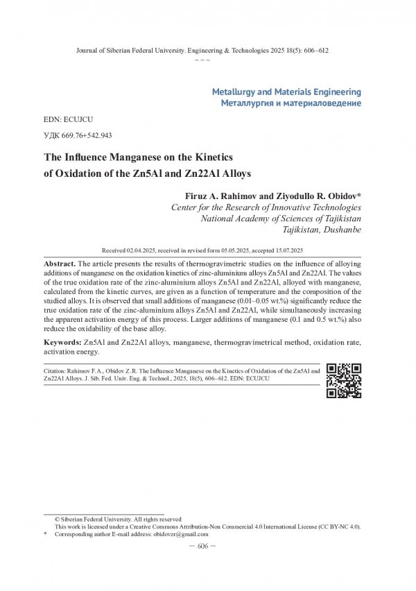 Библиографическое описание: Rahimov, Firuz A... The Influence Manganese on the Kinetics of Oxidation of the Zn5Al and Zn22Al Alloys = Влияние марганца на кинетику окисления сплавов Zn5Al и Zn22Al / F. A. Rahimov, Z. R. Obidov. - Текст : непосредственный // Журнал Сибирского федерального университета. Техника и технологии. - 2025. - Т. 18, № 5. - С. 606-612. - Библиогр.: с. 611-612. - ISSN 1999-494X.