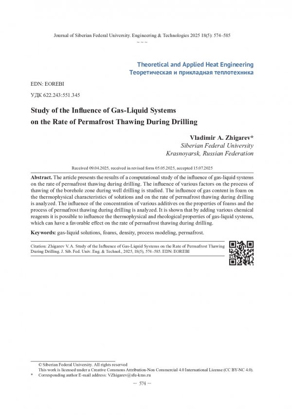 Библиографическое описание:Жигарев, В. А. Исследование влияния газожидкостных систем на скорость растепления многолетнемерзлых пород при бурении / В. А. Жигарев. - Текст : непосредственный // Журнал Сибирского федерального университета. Техника и технологии. - 2025. - Т. 18, № 5. - С. 574-585. - Библиогр.: с. 584-585. - ISSN 1999-494X.