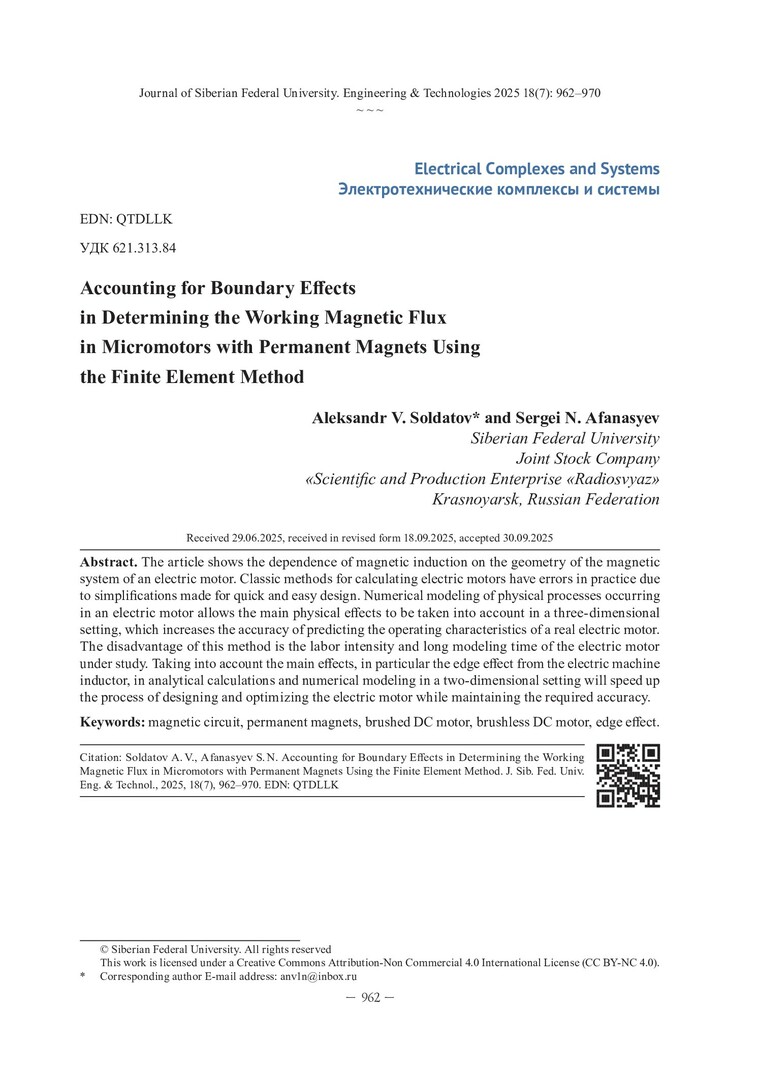 Библиографическое описание:Солдатов, А. В. Учет краевых эффектов при определении рабочего магнитного потока в микродвигателях с постоянными магнитами с помощью метода конечных элементов / А. В. Солдатов, С. Н. Афанасьев. - Текст : непосредственный // Журнал Сибирского федерального университета. Техника и технологии. - 2025. - Т. 18, № 7. - С. 962-970. - Библиогр.: с. 969-970. - ISSN 1999-494X.