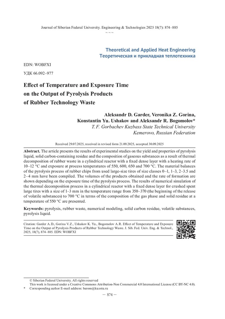 Библиографическое описание: Влияние температуры и времени выдержки на выход продуктов пиролиза резинотехнических отходов / А. Д. Гардер, В. З. Горина, К. Ю. Ушаков, А. Р. Богомолов. - Текст : непосредственный // Журнал Сибирского федерального университета. Техника и технологии. - 2025. - Т. 18, № 7. - С. 874-885. - Библиогр.: с. 884-885. - ISSN 1999-494X.