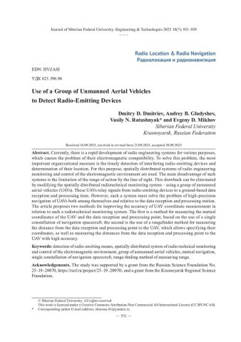 Библиографическое описание: Use of a Group of Unmanned Aerial Vehicles to Detect Radio-Emitting Devices = Применение группы беспилотных летательных аппаратов для обнаружения радиоизлучающих средств / D. D. Dmitriev, A. B. Gladyshev, V. N. Ratushnyak, E. D. Mikhov. - Текст : непосредственный // Журнал Сибирского федерального университета. Техника и технологии. - 2025. - Т. 18, № 7. - С. 931-939. - Библиогр.: с. 938-939. - ISSN 1999-494X.
