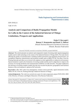 Аннотация:Представлен анализ и сравнительное исследование существующих моделей распространения радиосигнала, применяемых в технологии LoRa в контексте промышленного интернета вещей (IIoT). Рассматриваются основные факторы, влияющие на качество связи, включая параметры среды и характеристики оборудования. Проведён обзор эмпирических, детерминированных и стохастических моделей, таких как MED, ITU‑R, Two‑Ray, Close‑In, Floating Intercept и другие, с акцентом на их применимость в условиях промышленной эксплуатации. Особое внимание уделено ограничениям существующих моделей и необходимости их адаптации для повышения точности прогнозирования покрытия и надежности связи в LoRa‑сетях. Работа подчёркивает актуальность создания комплексных моделей, учитывающих физико‑географические и технические особенности среды для оптимизации сетей IIoT.