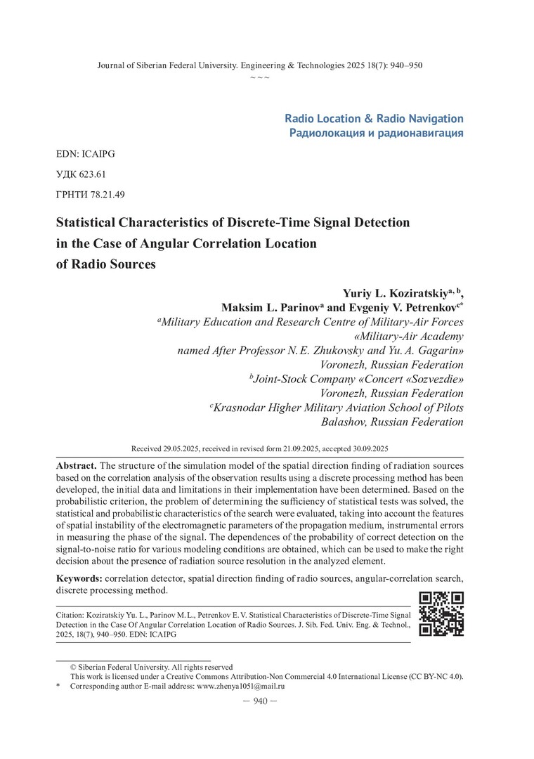 Аннотация:В статье представлена структура имитационной модели процесса пространственной пеленгации источников излучения на основе корреляционного анализа результатов наблюдений с применением дискретного метода обработки, определены исходные данные и ограничения при их реализации. На основе вероятностного критерия решена задача определения достаточности статистических испытаний, проведена оценка статистических и вероятностных характеристик поиска, учитывающая особенности пространственной нестабильности электромагнитных параметров среды распространения, инструментальных ошибок измерения фазы сигнала. Получены зависимости вероятности правильного обнаружения от соотношения сигнал/шум для различных условий моделирования, которые могут быть использованы в целях принятия правильного решения о наличии в анализируемом элементе разрешения источника излучения.