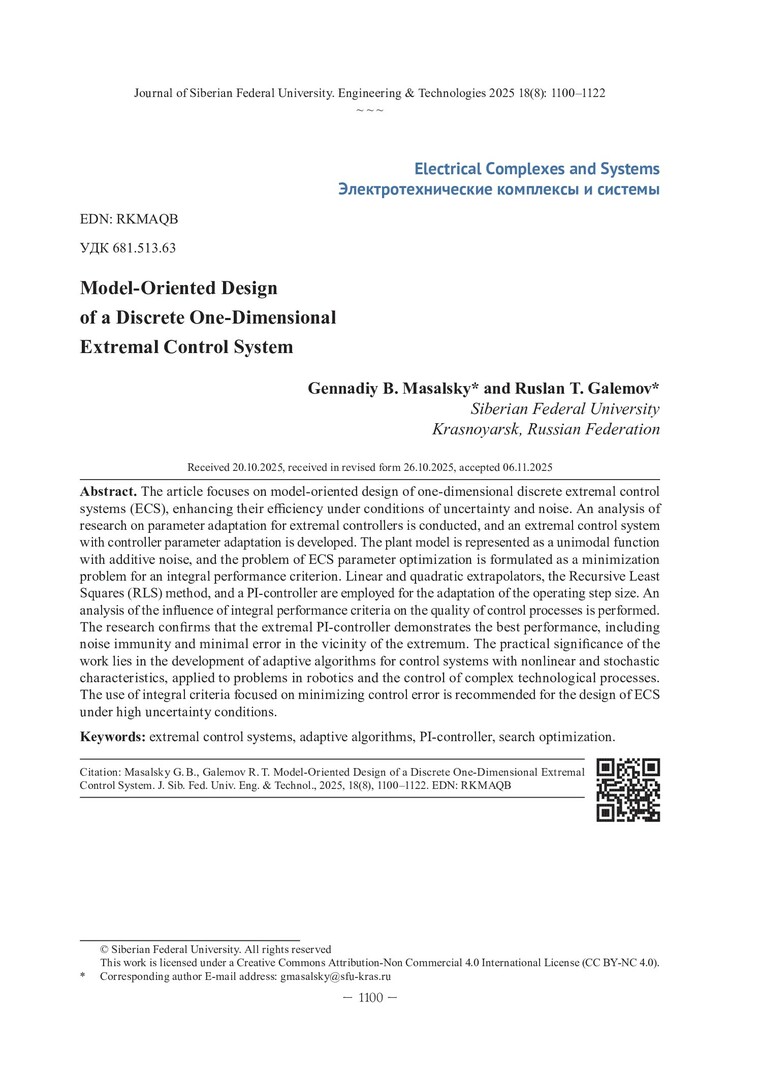 Аннотация: Статья посвящена модельно-ориентированному проектированию дискретных одномерных систем экстремального управления (СЭУ), повышению их эффективности в условиях неопределенности и помех. Проведен анализ работ по адаптации параметров экстремальных регуляторов, разработана система экстремального управления с адаптацией параметров регулятора. Модель объекта управления представлена унимодальной функцией с аддитивной помехой, а задача оптимизации параметров СЭУ сформулирована как задача минимизации интегрального критерия качества. Для адаптации рабочего шага использованы линейный и квадратичный экстраполяторы, рекуррентный метод наименьших квадратов (РМНК) и ПИ-регулятор. Проведен анализ влияния интегральных критериев эффективности на качество процессов управления. Исследования подтвердили, что экстремальный ПИ-регулятор демонстрирует наилучшие показатели, включая устойчивость к помехам и минимальную ошибку в области экстремума. Практическая значимость работы заключается в разработке адаптивных алгоритмов для систем управления с нелинейными и стохастическими характеристиками в задачах робототехники, управления сложными технологическими процессами. Рекомендовано использование интегральных критериев, ориентированных на минимизацию ошибки управления, для проектирования СЭУ в условиях высокой неопределенности.
