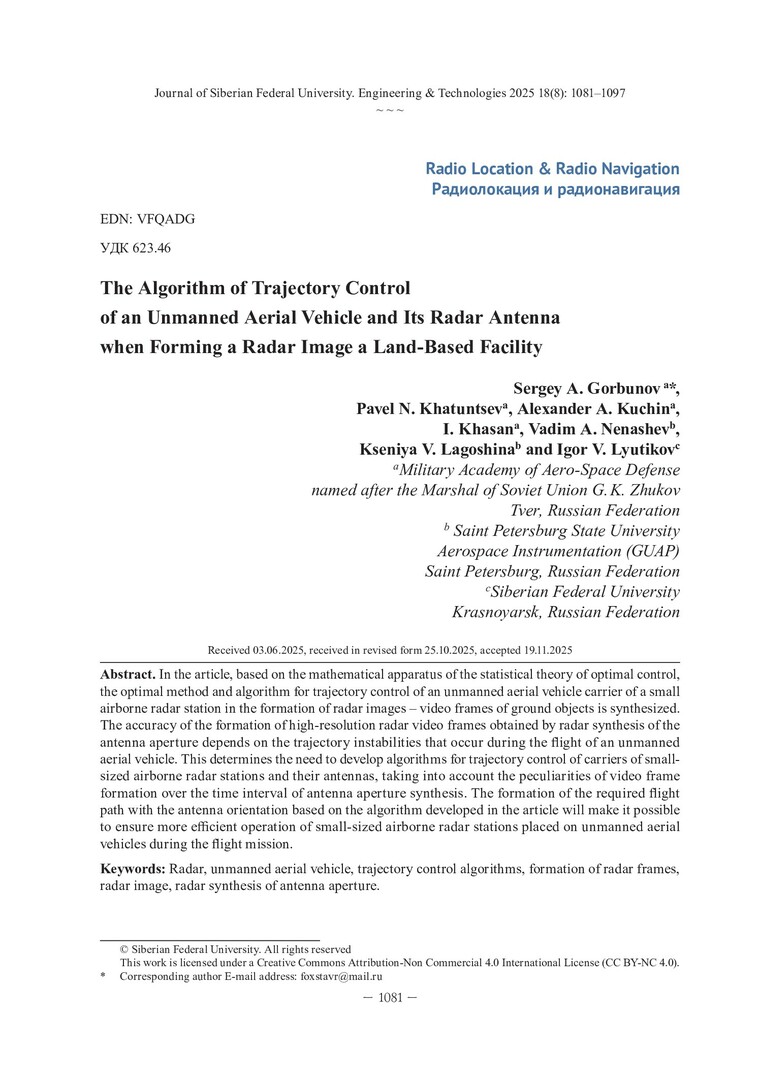 Библиографическое описание: Алгоритм траекторного управления беспилотным летательным аппаратом и антенной его радиолокационной станции при формировании радиолокационного изображения наземного объекта / С. А. Горбунов, П. Н. Хатунцев, А. А. Кучин [и др.]. - Текст : непосредственный // Журнал Сибирского федерального университета. Техника и технологии. - 2025. - Т. 18, № 8. - С. 1081-1097. - Библиогр.: с. 1096-1097. - ISSN 1999-494X.
