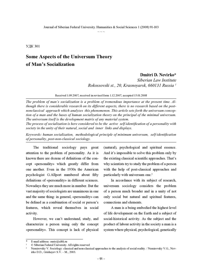 Библиографическое описание: Nevirko, Dmitri. Some Aspects of the Universum Theory of Man’s Socialization = Некоторые аспекты универсумной теории социализации человека / D. D. Nevirko. - Текст : непосредственный // Журнал Сибирского федерального университета. Гуманитарные науки. - 2008. - Т. 1, № 1. - С. 91-103. - ISSN 1997-1370.