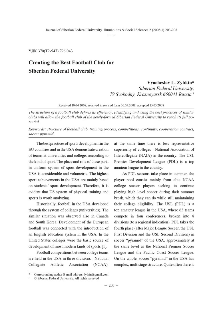 Библиографическое описание:Zybkin, Vyacheslav. Creating the Best Football Club for Siberian Federal University = Создание лучшего футбольного клуба Сибирского федерального университета / V. L. Zybkin. - Текст : непосредственный // Журнал Сибирского федерального университета. Гуманитарные науки. - 2008. - Т. 1, № 2. - С. 203-208. - Библиогр.: с. 208. - ISSN 1997-1370.