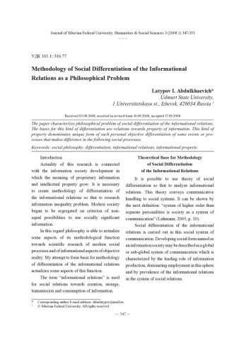 Библиографическое описание:Latypov, I. A. Methodology of Social Differentiation of the Informational Relations as a Philosophical Problem = Методология социальной дифференциации информационных отношений как философская проблема / Abdulkhaevich Latypov I. - Текст : непосредственный // Журнал Сибирского федерального университета. Гуманитарные науки. - 2008. - Т. 1, № 3. - С. 347-353. - Библиогр.: с. 352-353. - ISSN 1997-1370.