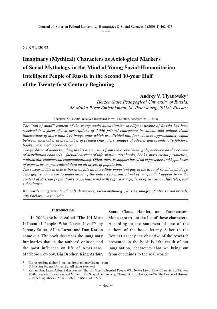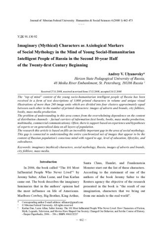 Библиографическое описание:Ulyanovsky, Andrey. Imaginary (Mythical) Characters as Axiological Markers of Social Mythology in the Mind of Young Social-Humanitarian Intelligent People of Russia in the Second 10-year Half of the Twenty-first Century Beginning = Вымышленные существа как аксиологические маркеры социальной мифологии в сознании молодой социально-гуманитарной интеллигенции России второй половины первого десятилетия XXI века / A. V. Ulyanovsky. - Текст : непосредственный // Журнал Сибирского федерального университета. Гуманитарные науки. - 2008. - Т. 1, № 4. - С. 462-473. - ISSN 1997-1370.