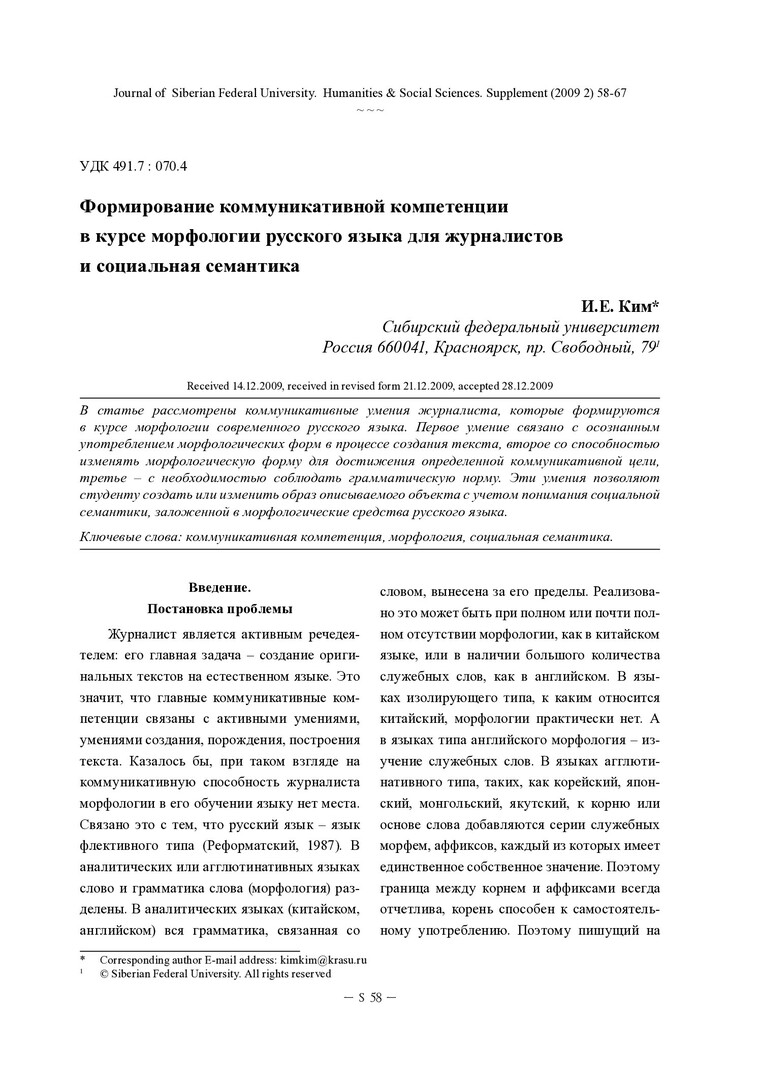 Библиографическое описание:Ким, Игорь. Формирование коммуникативной компетенции в курсе морфологии русского языка для журналистов и социальная семантика = Creating Oral and Written Communication Skills in the Course of Russian Morphology for the Students of Journalism and Social Semantics / И. Е. Ким. - Текст : непосредственный // Журнал Сибирского федерального университета. Гуманитарные науки. - 2009. - Т. 2, Спецвып. - С. 58-67. - Библиогр.: с. 66-67. - ISSN 1997-1370.