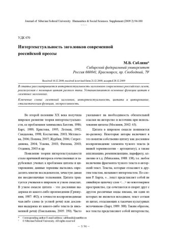 Библиографическое описание:Саблина, Марина. Интертекстуальность заголовков современной российской прессы = Intertextuality of Modern Russian Newspapers' Headlines / М. В. Саблина. - Текст : непосредственный // Журнал Сибирского федерального университета. Гуманитарные науки. - 2009. - Т. 2, Спецвып. - С. 94-100. - Библиогр.: с. 98-100. - ISSN 1997-1370.