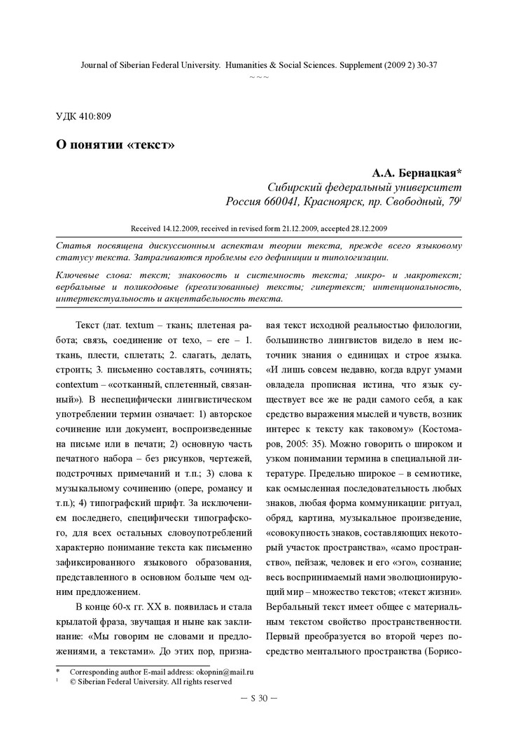 Библиографическое описание: Бернацкая, Ада. О понятии "текст" = On the Concept of the Text / А. А. Бернацкая. - Текст : непосредственный // Журнал Сибирского федерального университета. Гуманитарные науки. - 2009. - Т. 2, Спецвып. - С. 30-37. - Библиогр.: с. 36-37. - ISSN 1997-1370.