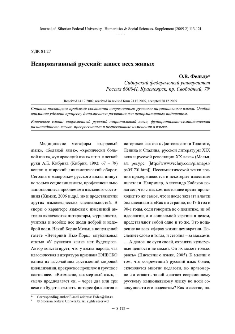 Библиографическое описание:Фельде, Ольга. Ненормативный русский: живее всех живых = Not Normative Russian Language is Always Alive / О. В. Фельде. - Текст : непосредственный // Журнал Сибирского федерального университета. Гуманитарные науки. - 2009. - Т. 2, Спецвып. - С. 113-121. - Библиогр.: с. 120-121. - ISSN 1997-1370.
