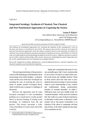 Библиографическое описание:Kuksa, Larisa. Integrated Sociology: Synthesis of Classical, Non-Classical and Post-Nonclassical Approaches in Cognizing the Society = Интегрированная социология: синтез классического, неклассического и постнеклассического подходов в изучении общества / L. P. Kuksa. - Текст : непосредственный // Журнал Сибирского федерального университета. Гуманитарные науки. - 2009. - Т. 2, № 1. - С. 104-112. - Библиогр.: с. 111-112. - ISSN 1997-1370.