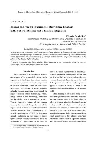 Библиографическое описание:Akulich, Viktoria. Russian and Foreign Experience of Distributive Relations in the Sphere of Science and Education Integration = Российский и зарубежный опыт распределительных отношений в области интеграции науки и высшего образования / V. G. Akulich. - Текст : непосредственный // Журнал Сибирского федерального университета. Гуманитарные науки. - 2009. - Т. 2, № 1. - С. 94-103. - Библиогр.: с. 103-104. - ISSN 1997-1370.