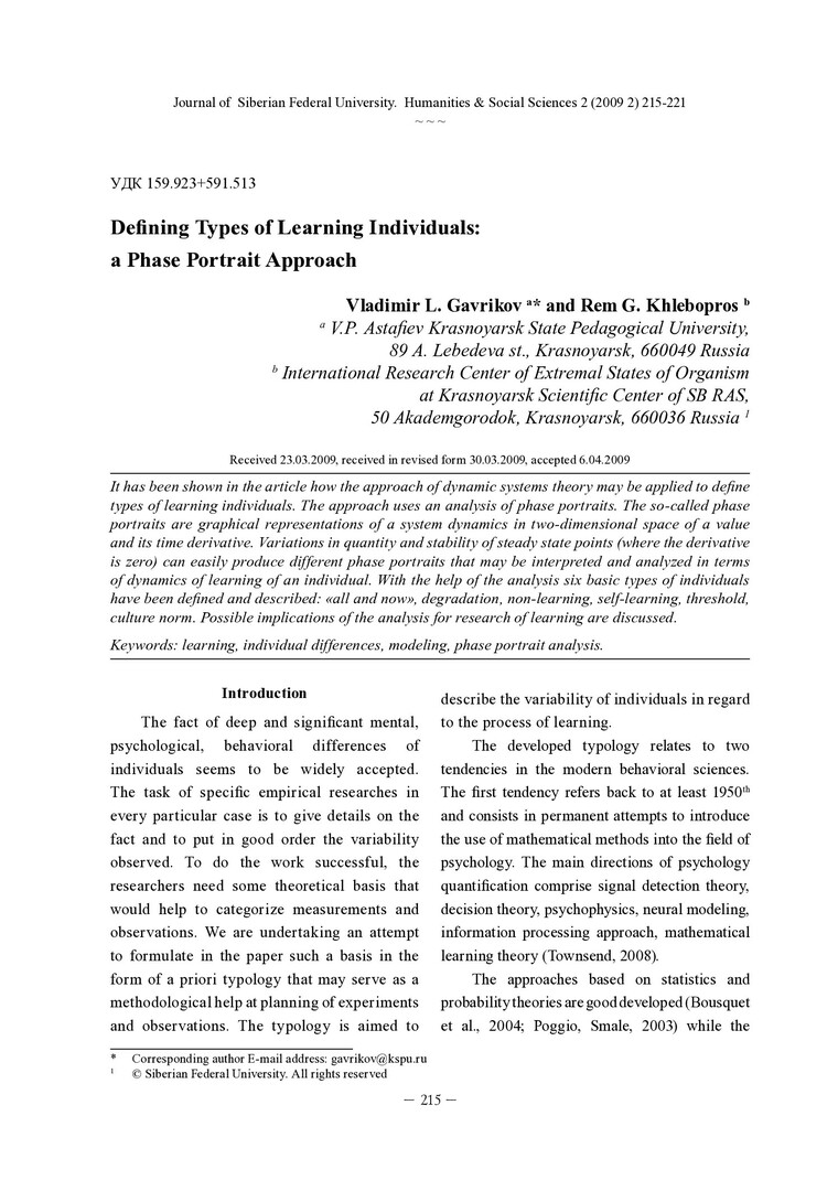 Библиографическое описание:Gavrikov, Vladimir. Defining Types of Learning Individuals: a Phase Portrait Approach = Выделение типов обучаемости индивидов: подход на основе анализа фазовых портретов / V. L. Gavrikov, R. G. Khlebopros. - Текст : непосредственный // Журнал Сибирского федерального университета. Гуманитарные науки. - 2009. - Т. 2, № 2. - С. 215-221. - Библиогр.: с. 221 . - ISSN 1997-1370.