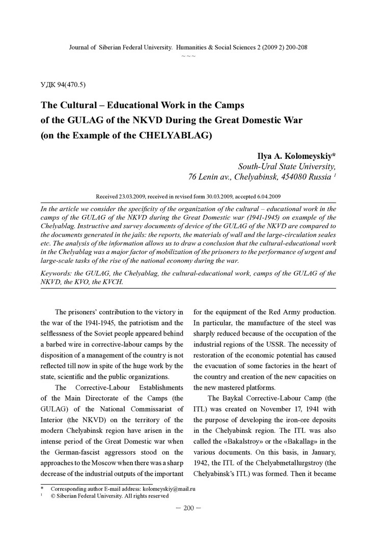 Библиографическое описание:Kolomeyskiy, Ilya. The Cultural – Educational Work in the Camps of the GULAG of the NKVD During the Great Domestic War (on the Example of the CHELYABLAG) = Культурно-просветительская работа в лагерях ГУЛАГ и НКВД во время Великой Отечественной войны (на примере ЧЕЛЯБЛАГа) / I. A. Kolomeyskiy. - Текст : непосредственный // Журнал Сибирского федерального университета. Гуманитарные науки. - 2009. - Т. 2, № 2. - С. 200-208. - Библиогр.: с. 208. - ISSN 1997-1370.