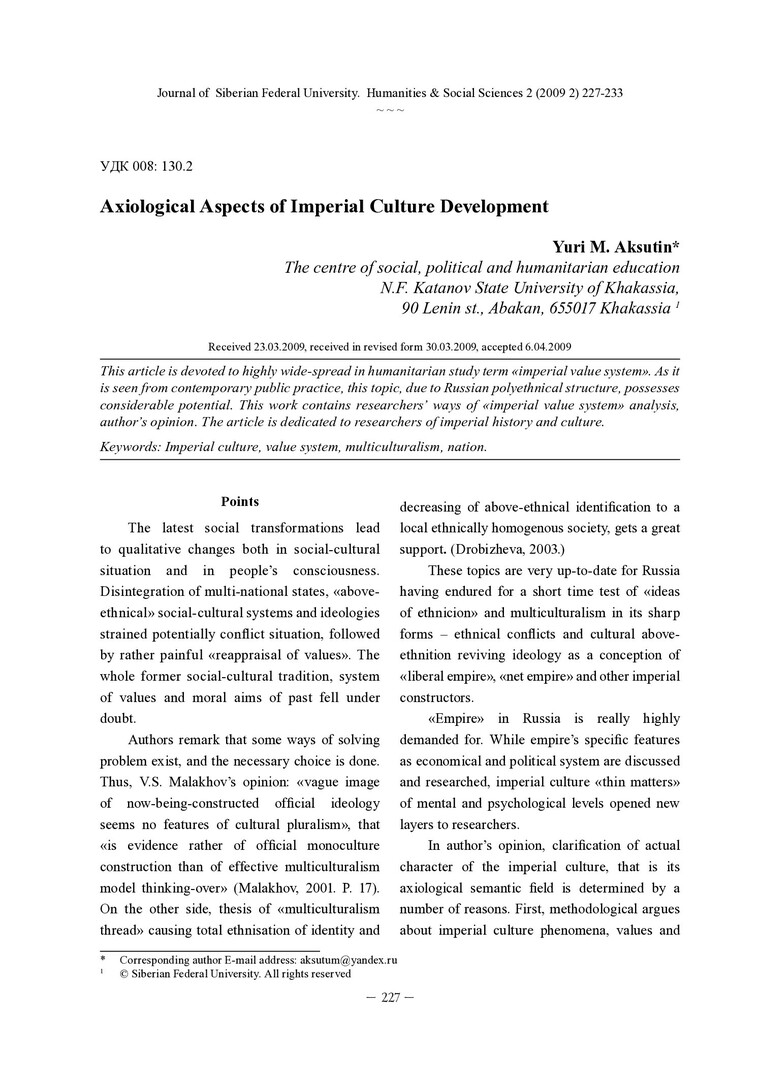 Библиографическое описание:Aksutin, Yuri. Axiological Aspects of Imperial Culture Development = Аксиологические аспекты развития имперской культуры / Y. M. Aksutin. - Текст : непосредственный // Журнал Сибирского федерального университета. Гуманитарные науки. - 2009. - Т. 2, № 2. - С. 227-233. - Библиогр.: с. 232-233 . - ISSN 1997-1370.